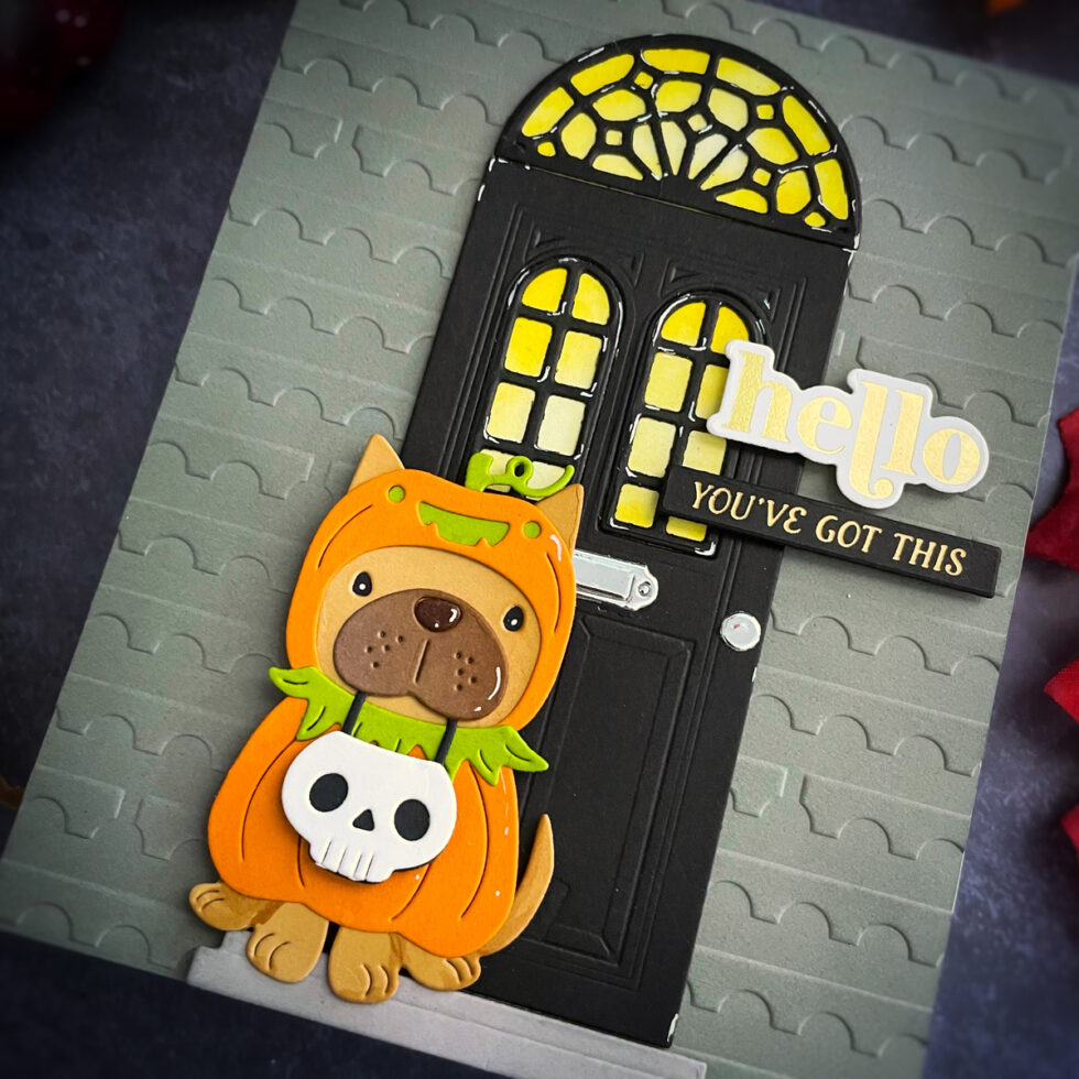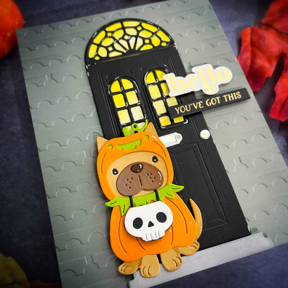 This card was a lot of fun to create, and I’m thrilled with how all the elements came together. The combination of the textured background, the elegant door, and the charming pup makes for a unique and heartwarming Halloween greeting.