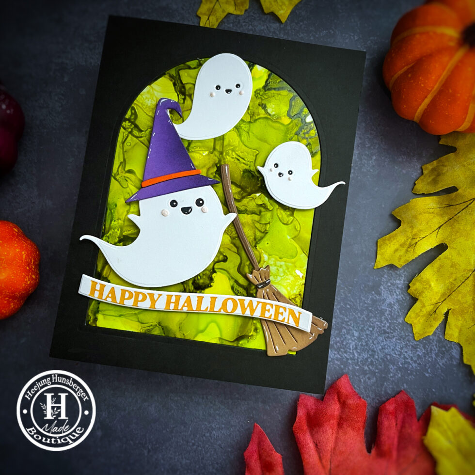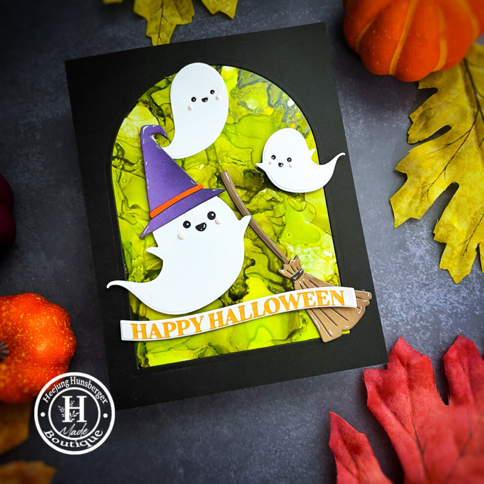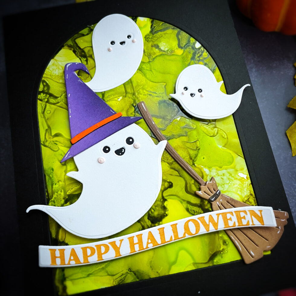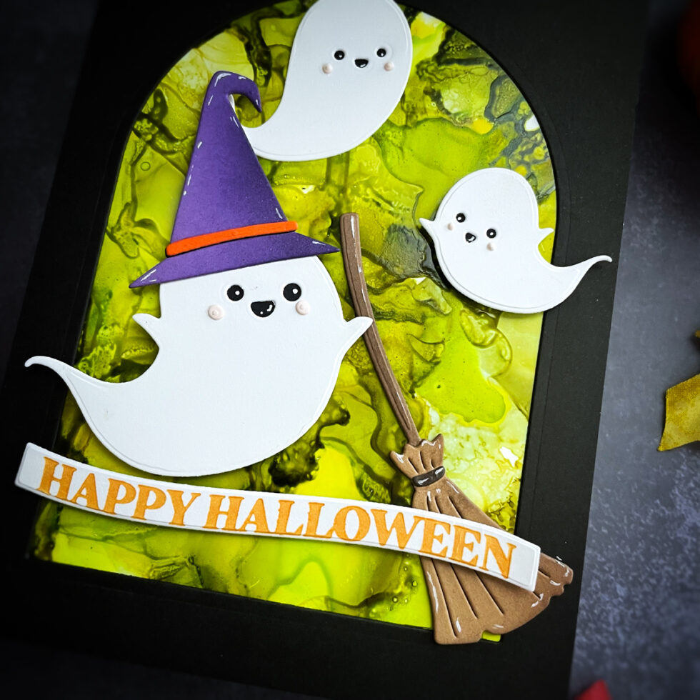 This card features a fun and spooky background created with alcohol inks. I started by dropping three colors of alcohol ink—yellow, green, and a deep artichoke—onto Yupo paper. Then, I added some alcohol blending solution and used a hot tool to mix and dry the inks, creating a beautiful, organic, blended pattern.