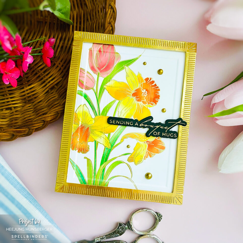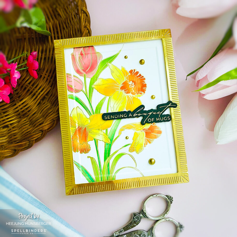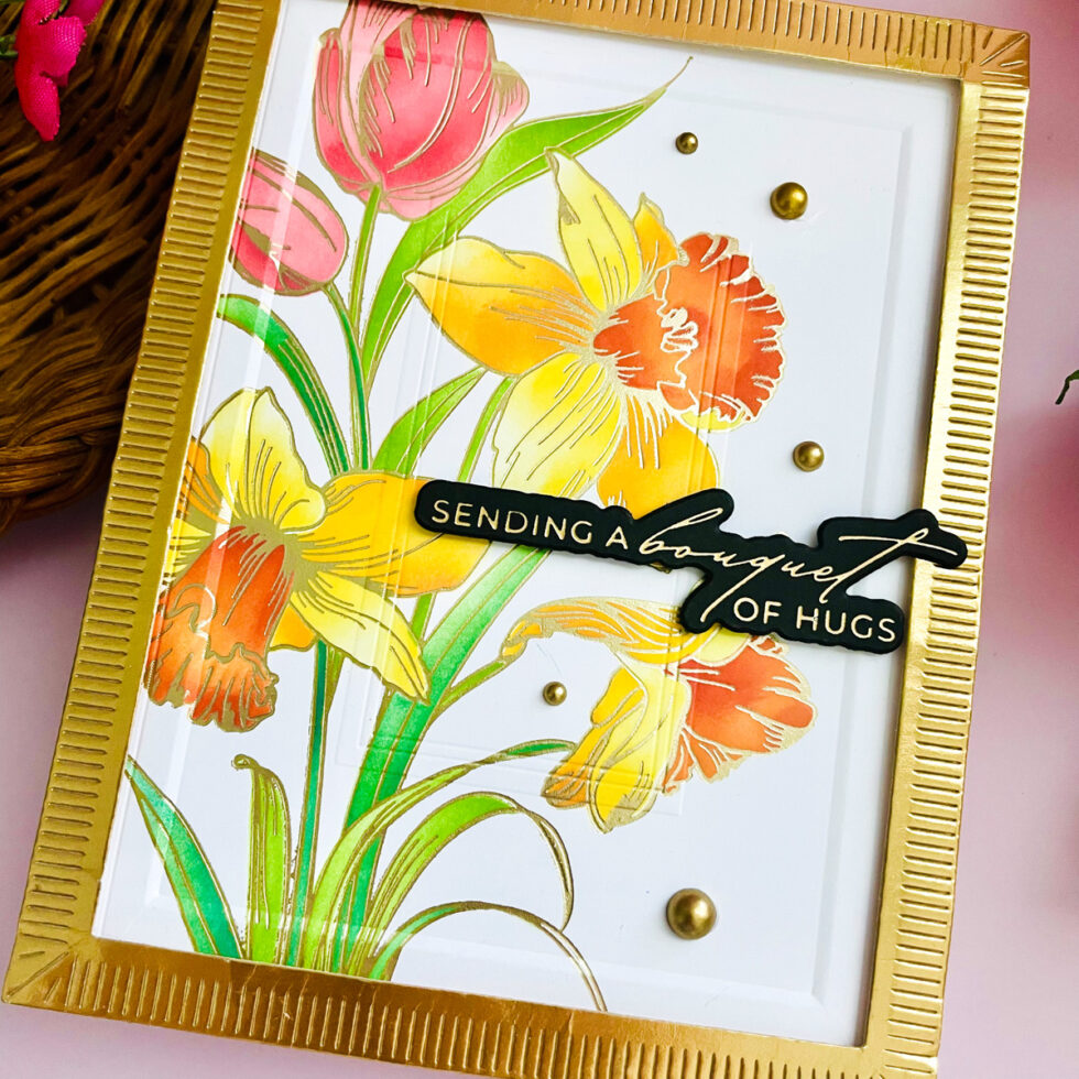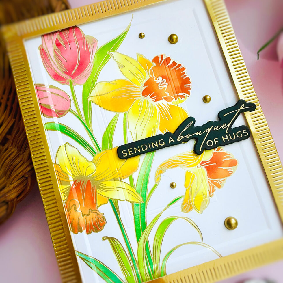 Using the coordinating stencils from the bundle, vibrant shades of pink, yellow, and orange are blended onto the tulips and daffodils. This adds soft yet impactful color that perfectly complements the gold foiling.