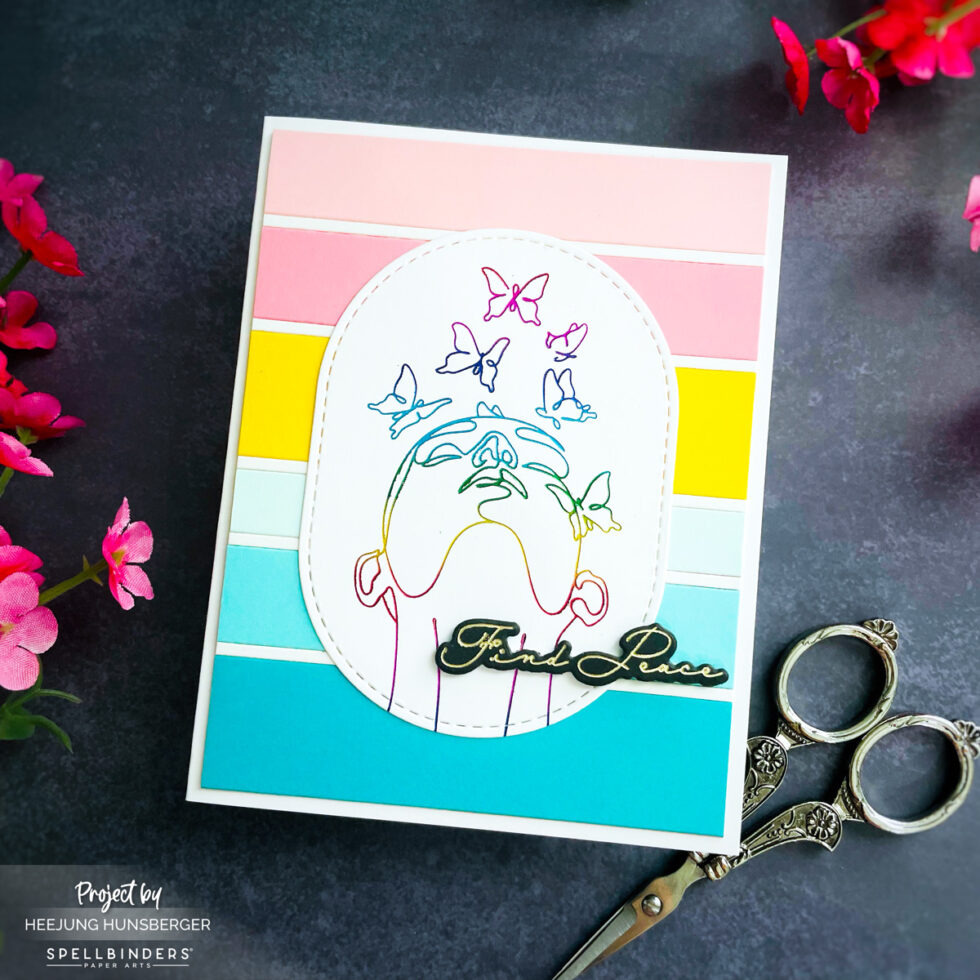 To create a clean, elegant focus, I die-cut the foiled panel using a stitched oval from the Scallop and Stitched Edge Ovals Etched Dies (from the Wildflowers Collection). This framed the silhouette perfectly and gave it a soft, finished edge.