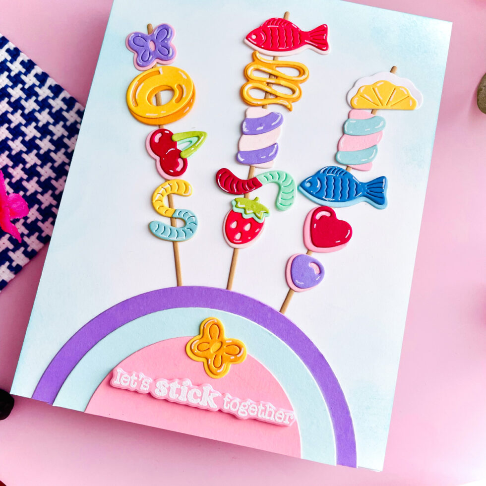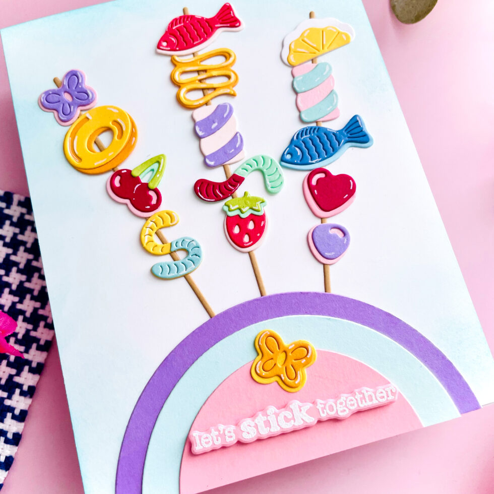 This cheerful project is all about the Candy Kebob Die Set by Carly Tee. The set features so many fun and whimsical candy shapes that it was a total delight to “build” these kebobs! I envisioned a sweet rainbow base for my treats, so I die-cut a circle die in half to create a striped semi-circle for the kebobs to be “planted” in.