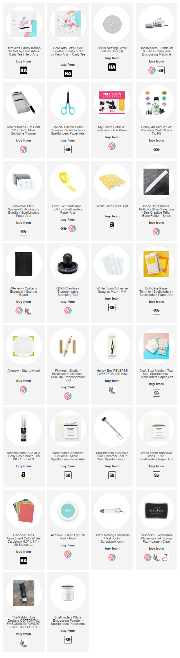 To make sure the colorful candies popped against the background, I took a simple white cardstock panel and softly blended Altenew’s Pool ink on the corners with a blending brush, leaving the center clean and bright. I die-cut the various gummy candies from a rainbow of Spellbinders color cardstocks and then used a simple white gel pen to draw high-definition highlights, giving them that irresistible, glossy, gummy look. For the sentiment, I used the Let’s Stick Together Stamp & Cut set, heat embossing the phrase in white on Blush cardstock and then die-cutting it to fit.