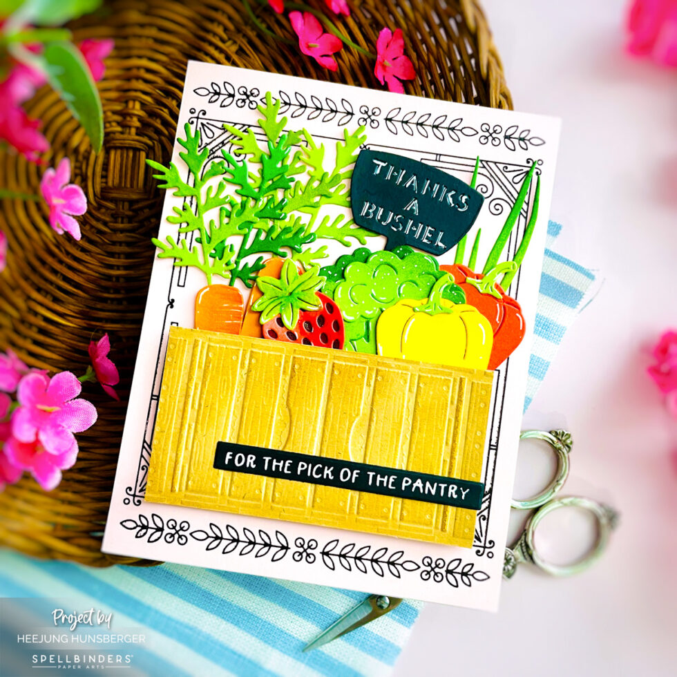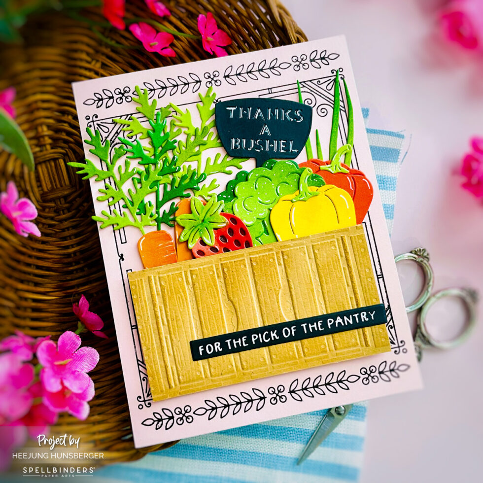 Sentiments: Hot foil “Thanks a Bushel” and the accompanying strip from the Seed Co. set. The white-on-black strip adds a nice bold touch to the front of the crate.