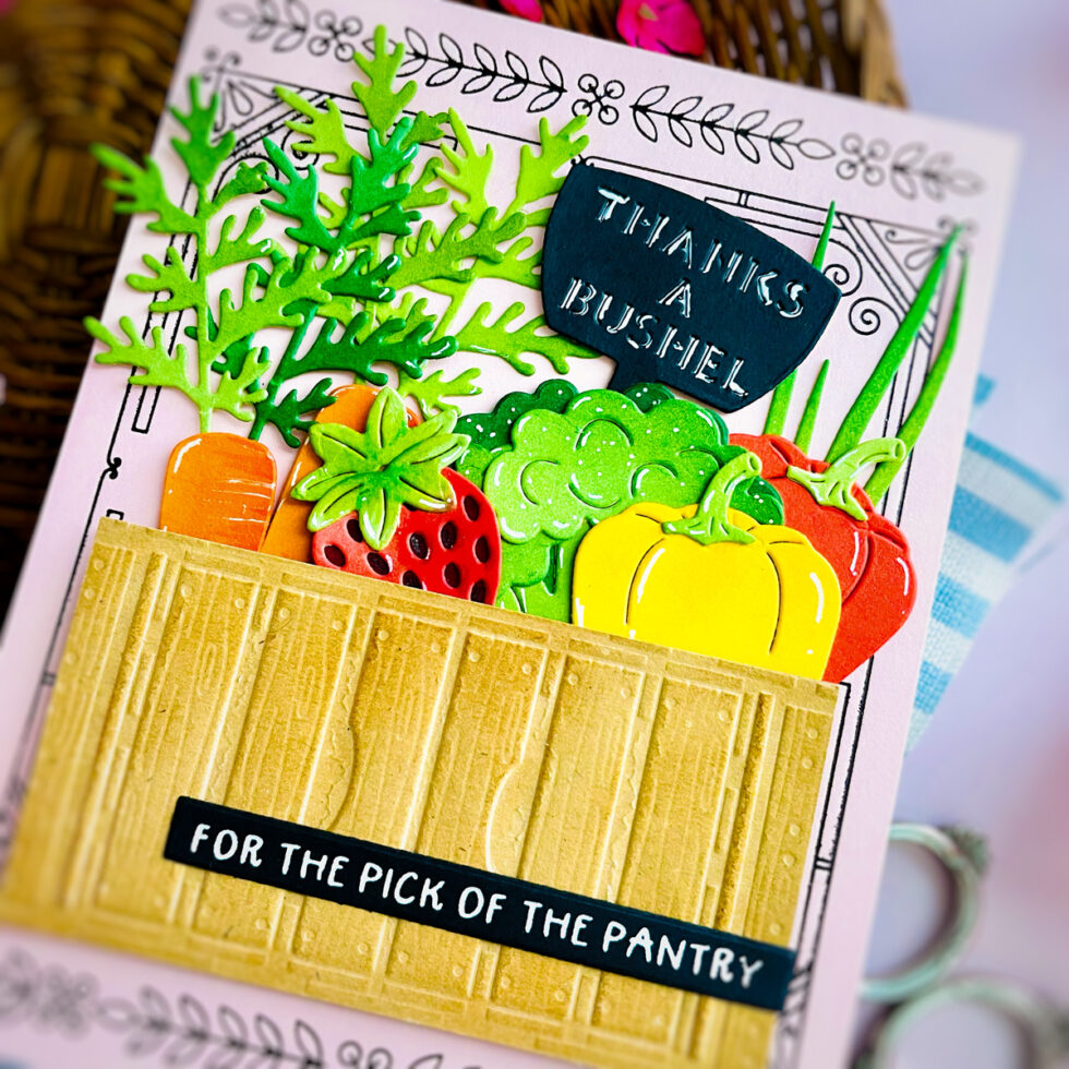 Inside the crate, I “packed” a variety of goodies. The carrots and onion stalks are from the April Stitching Die set (Rooting For You), and the adorable strawberries are from the Market Jar Trio (this month’s All Clubs Crate Bonus Die set). To add even more variety, I included some leafy greens and a yellow bell pepper from the Large Die set.