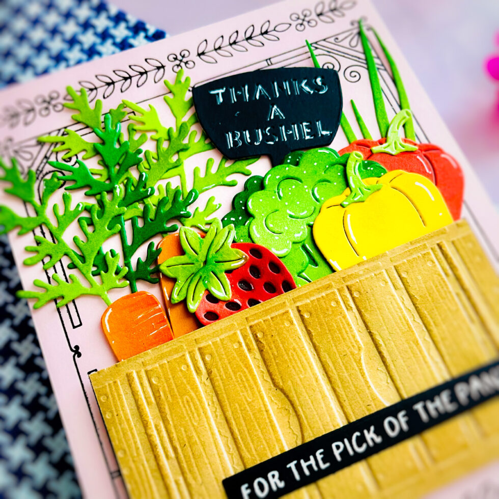 I also used the wooden picket sign from the Stitching Die set to add the “Thanks a Bushel” sentiment, and finished it off with another foiled sentiment from the Press & Foil Club, hot foiled in white on black for that crisp contrast.