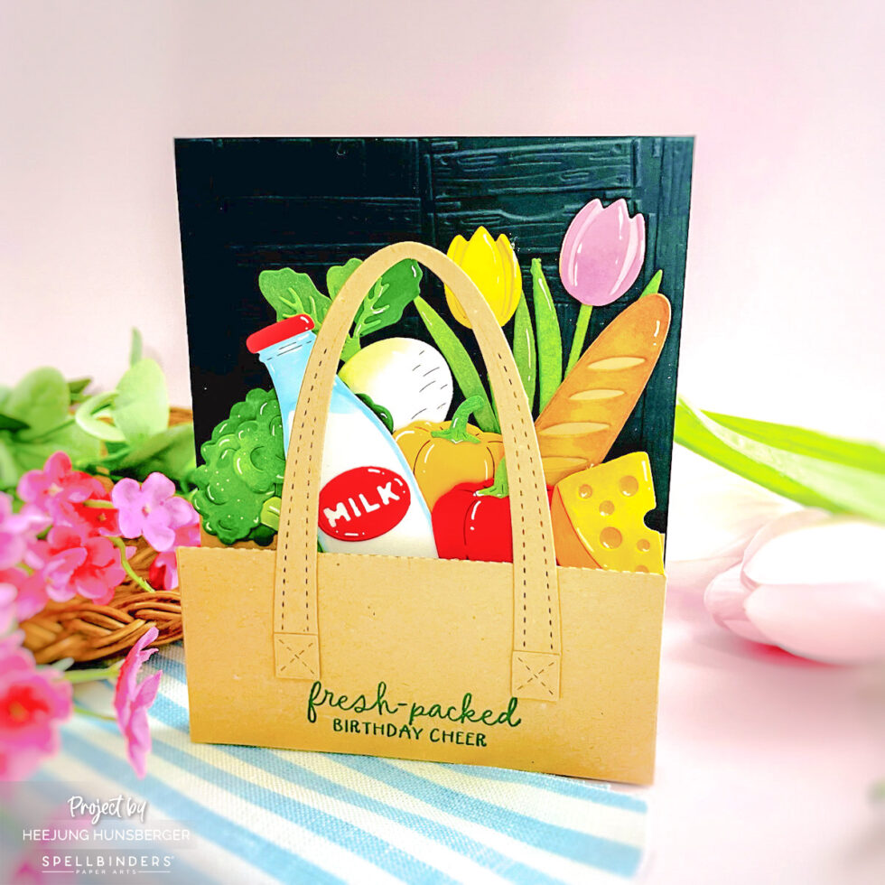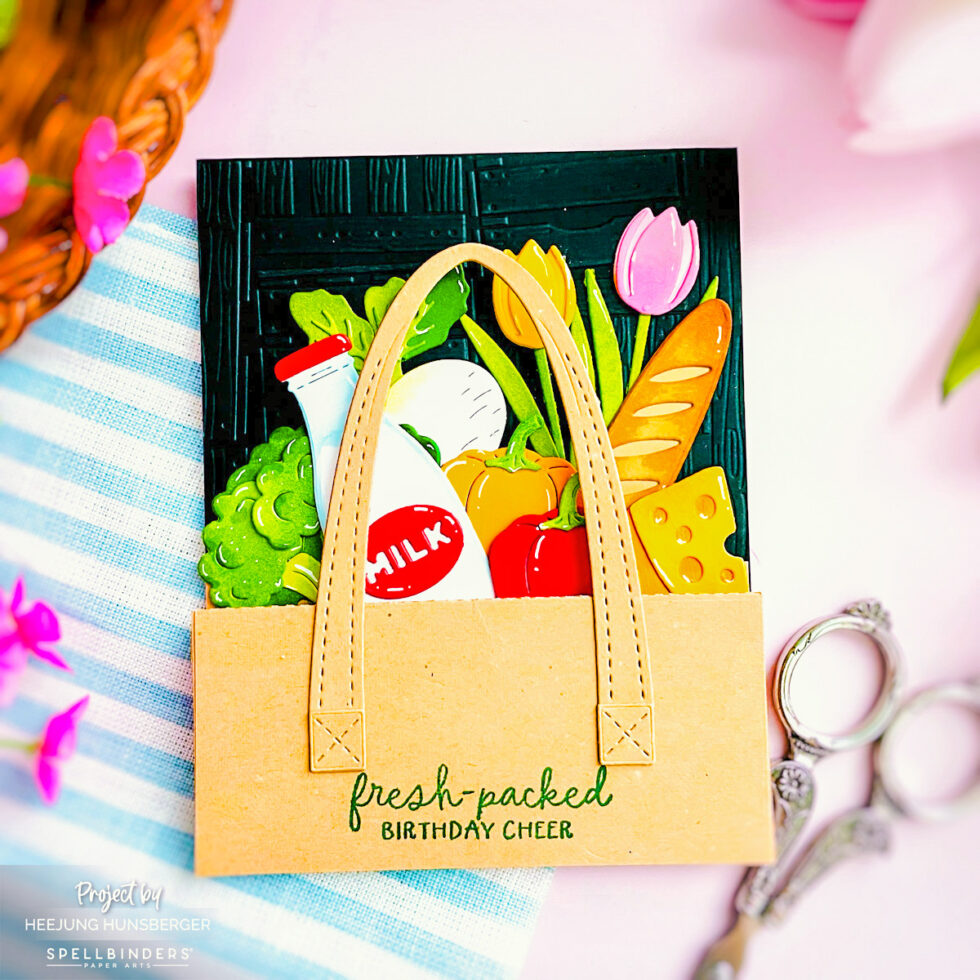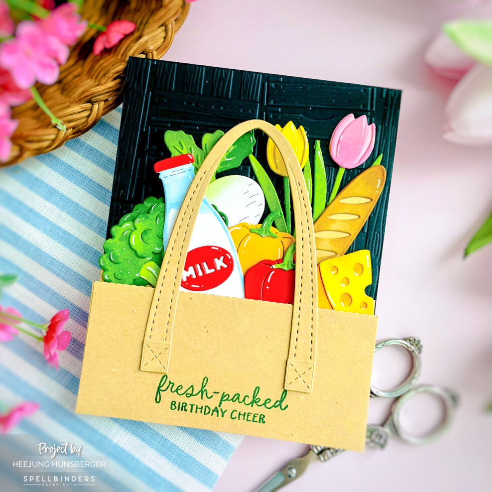 Hello, crafty friends! As a homemaker who goes grocery shopping once or twice a week, this card is perhaps the most special to me because it captures my real everyday life. There’s something so satisfying about filling a shopping bag with fresh baguettes, cheese, bell peppers, broccoli, and milk. And of course, when spring comes, I always love to treat myself to a bunch of tulips or a small potted plant to brighten up the house!