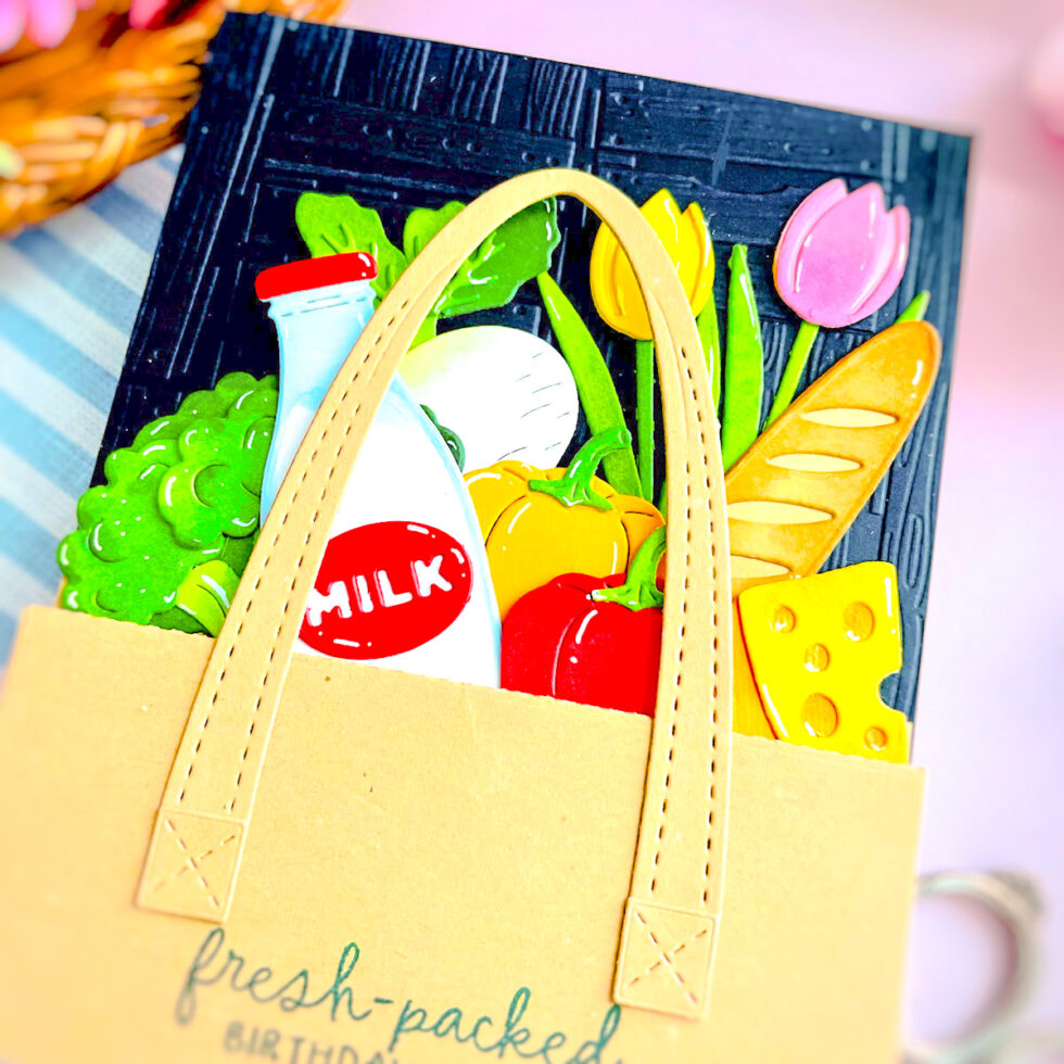 One of my favorite details is the classic glass milk bottle. Since I wanted it to look like it was actually filled with milk, I die-cut it from white cardstock and used a light blue marker to shade just the top and sides, giving it that translucent glass look. All the other groceries were die-cut from colored cardstock and enhanced with ink blending for extra depth and realism.