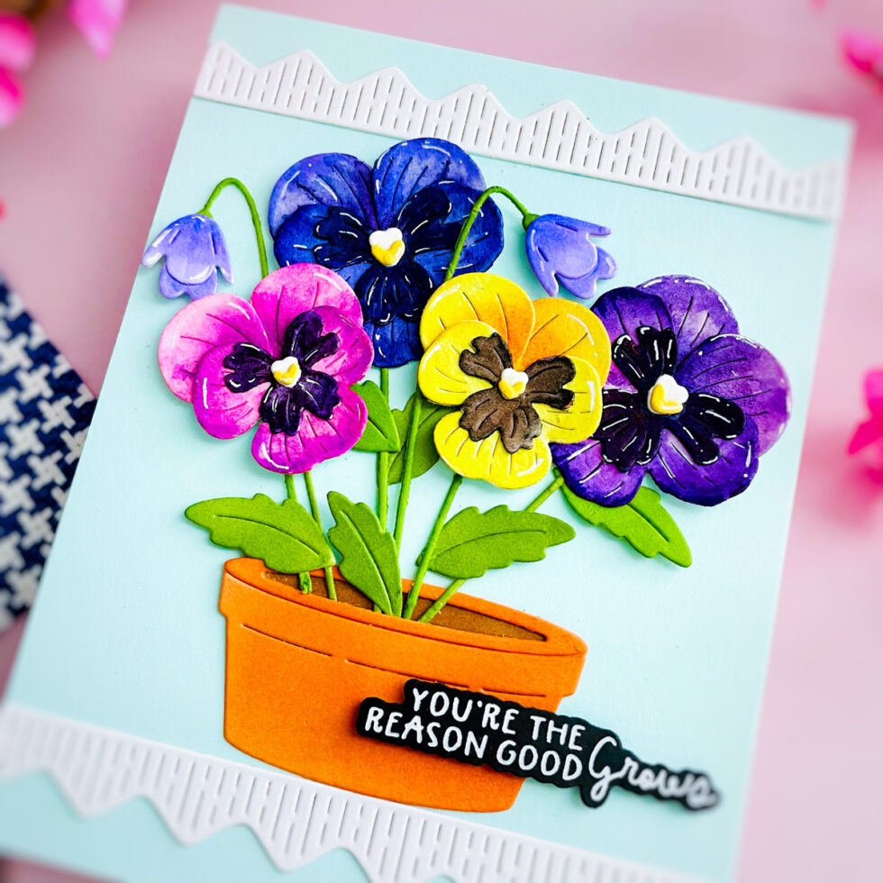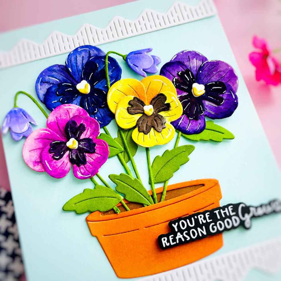 For this project, I really wanted to capture the natural beauty of real pansies. Instead of using colored cardstock for the blooms, I die-cut the petals from watercolor cardstock and hand-painted each one. This allowed me to achieve those characteristic gradients and deep tones that make pansies so unique.