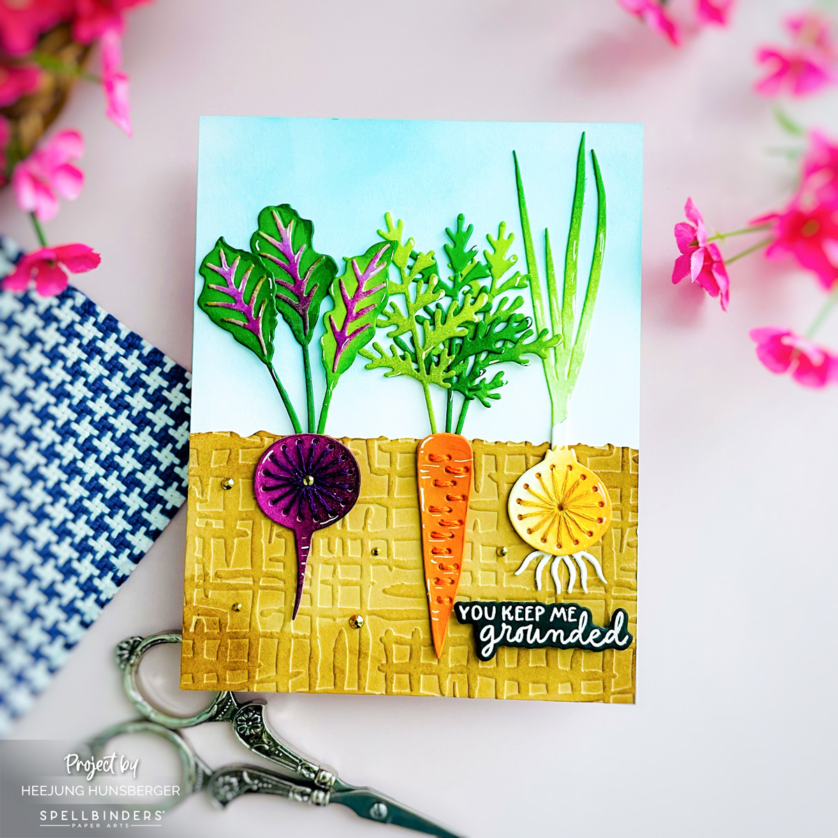The sentiment “You Keep Me Grounded” comes from the April 2026 Clear Stamp & Die of the Month (Fresh-Packed). I heat embossed it in white on black cardstock for that crisp, clean contrast. For a final bit of fun, I added some “gold in the ground”—sparkly gold gems scattered across the soil for a touch of shimmer!