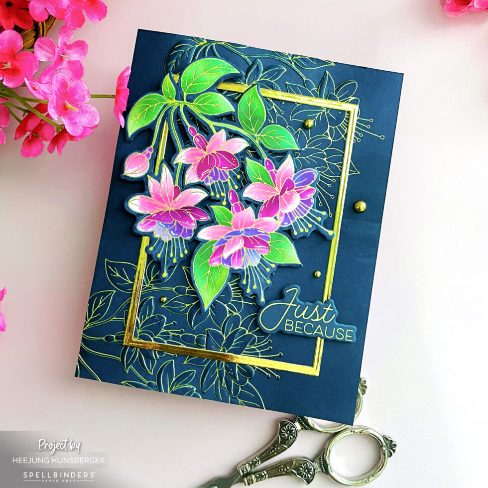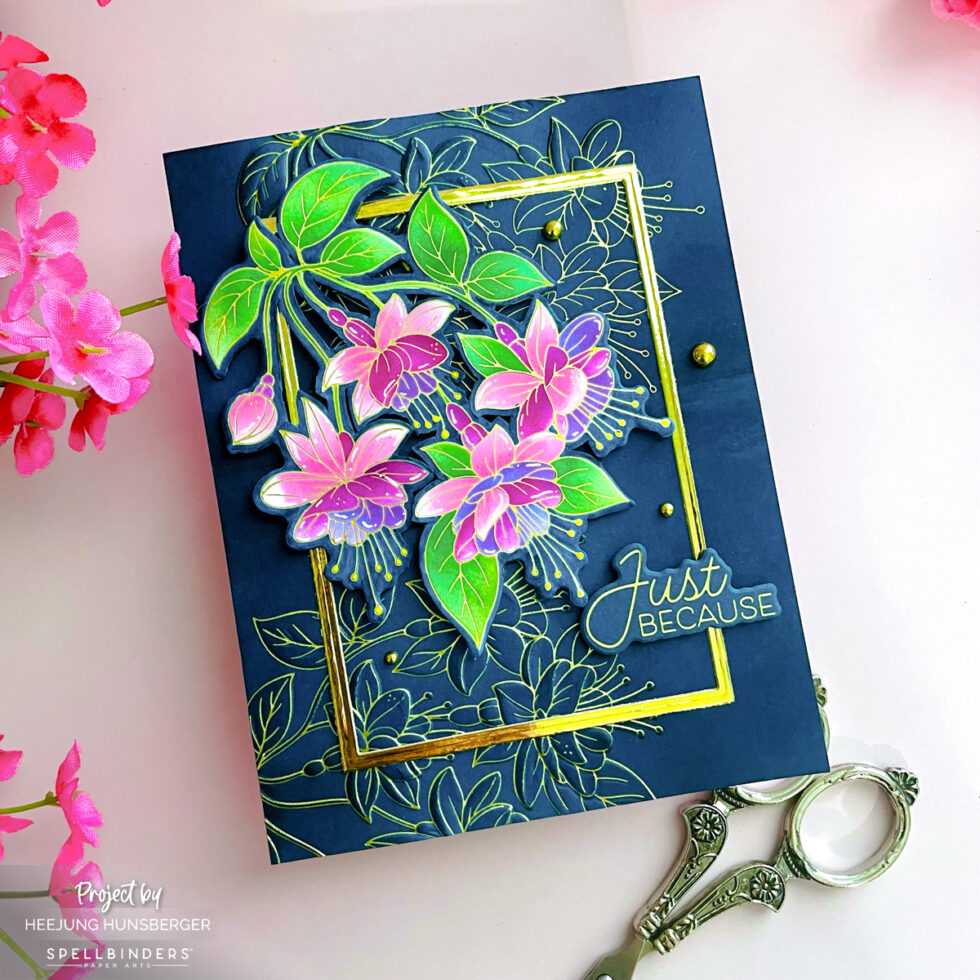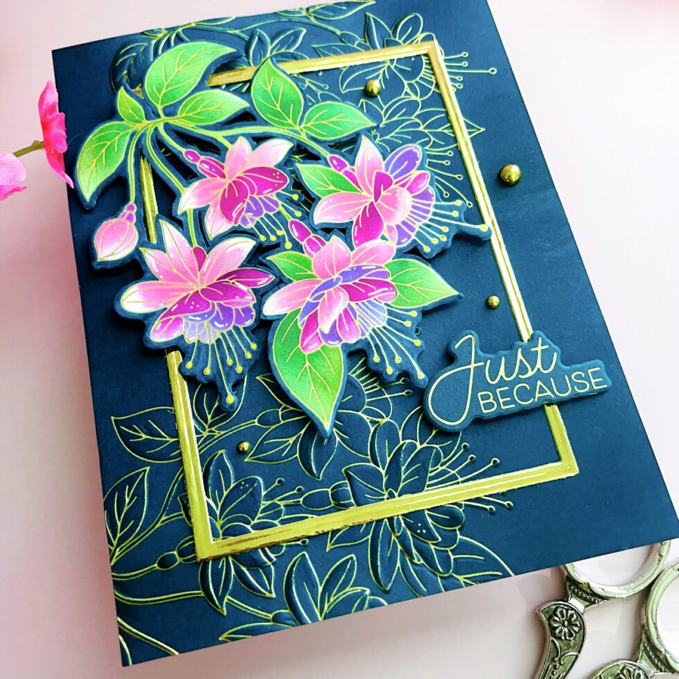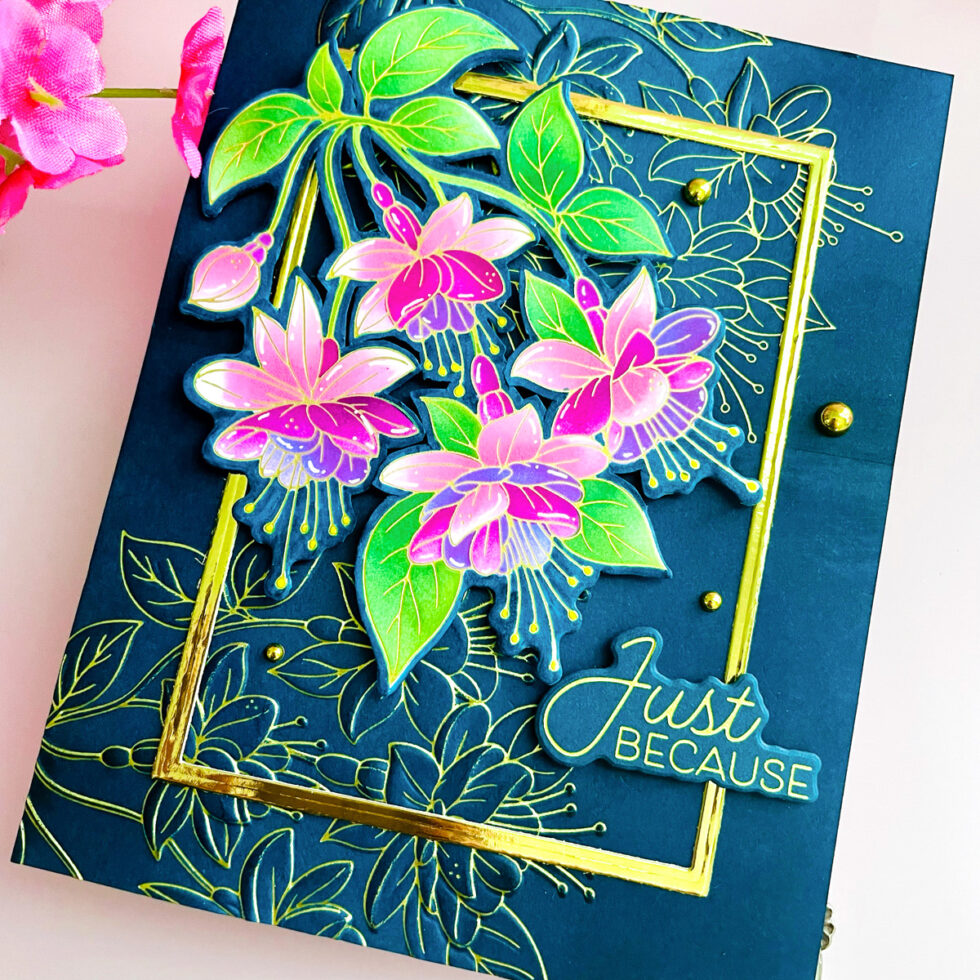 Fussy Cutting for Precision: The main fuchsia branch was hot foiled in Matte Gold on white cardstock and colored with alcohol markers. To achieve a truly intricate look, I used my scissors to fussy cut and remove the white spaces between the stems and leaves, making the floral spray look much more delicate and realistic.