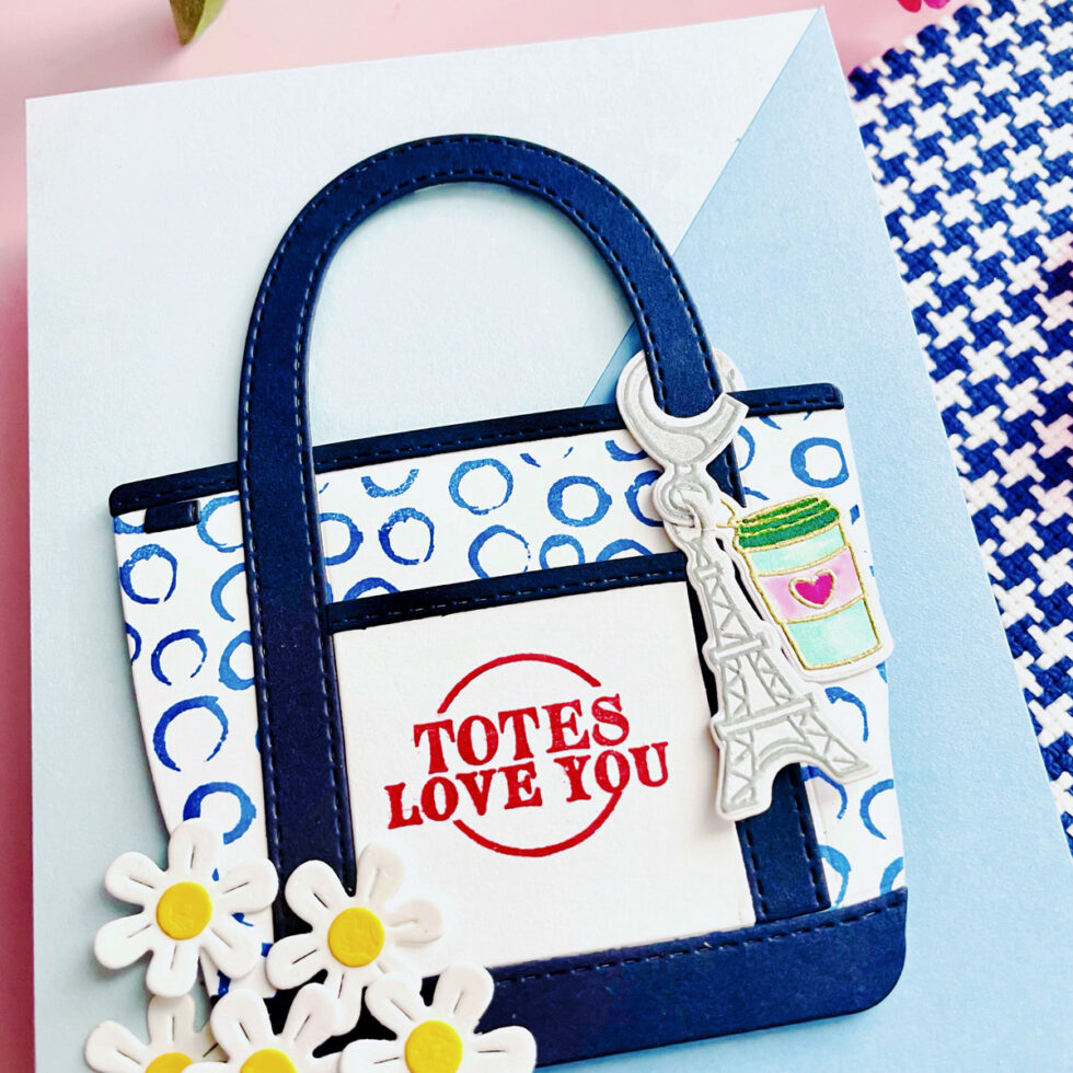 Building the Tote Bag The star of the show is the Tote Bag Die. I used Indigo cardstock for the structural elements—the handles, the bottom trim, and the top border—to give it a sturdy, classic look. For the main body of the bag, I used a Background Builder stamp with a water droplet pattern, inking it in a vibrant blue on white cardstock before die-cutting the base.