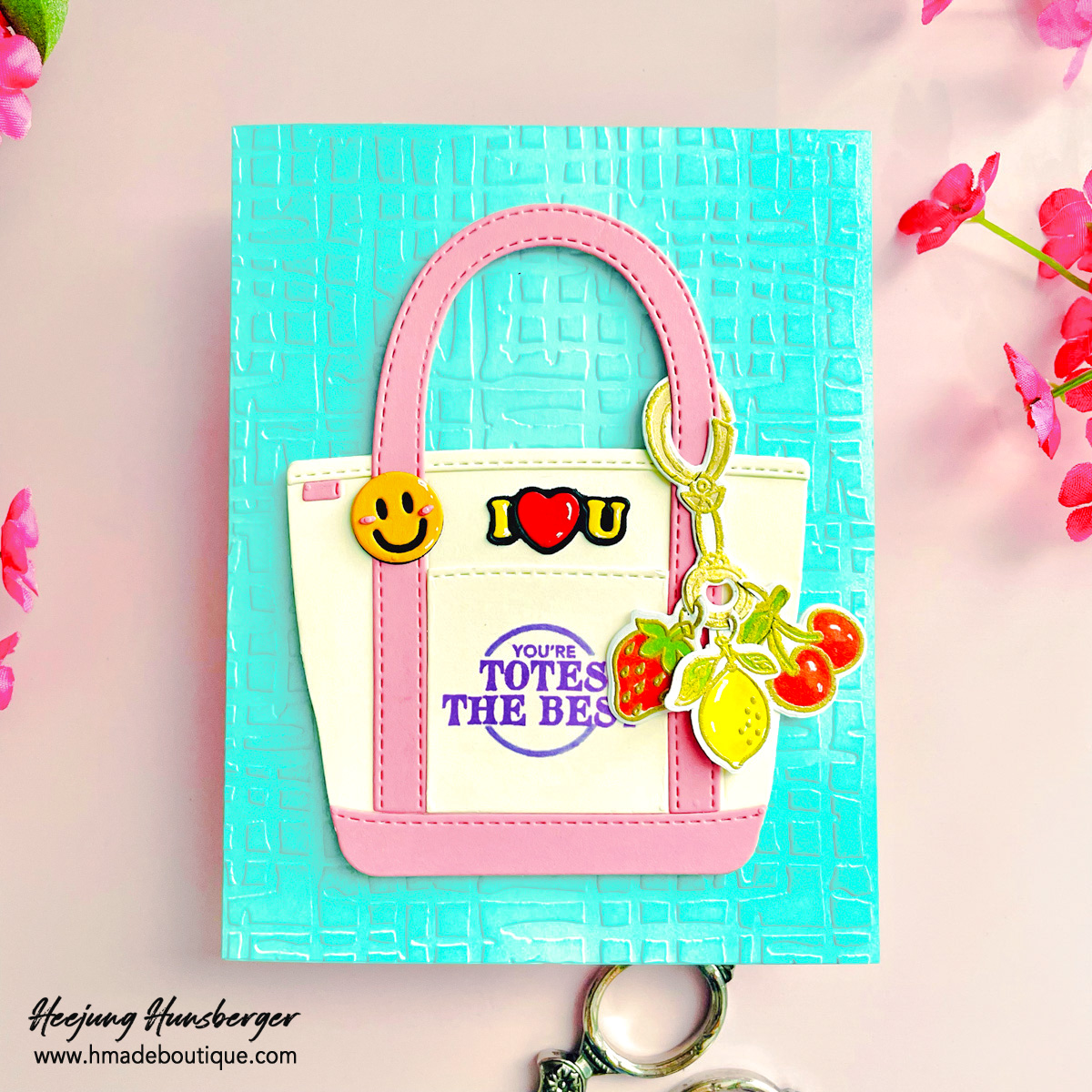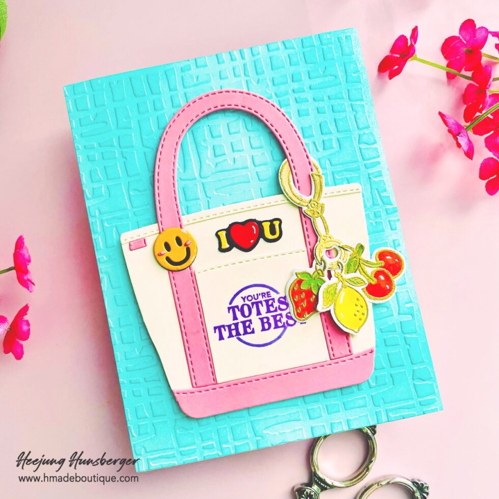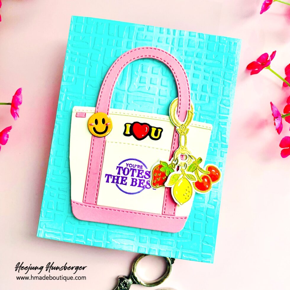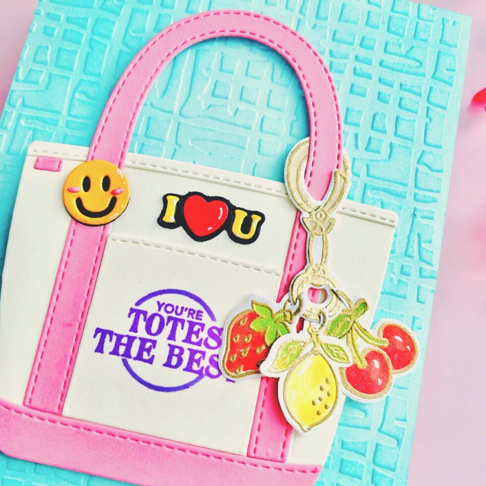 Custom Charms and Flair The details are where the magic happens! I used the Tiny Treasure stamp and die set to create a fruit-themed keychain. I finished these with gold heat embossing and colored them with markers before die-cutting and hanging them from the handle. To add even more personality, I used the Got Flair die set to create the “I ❤️ U” and smiley face accents, giving the bag a trendy, customized “patch” look.